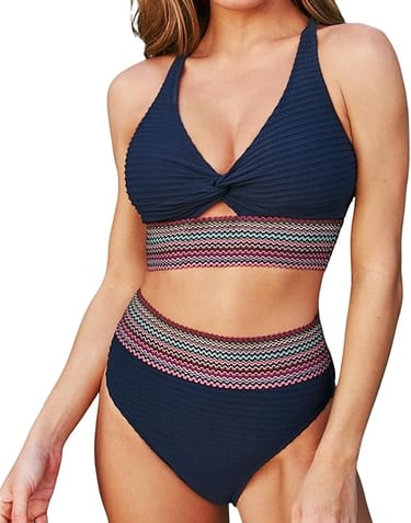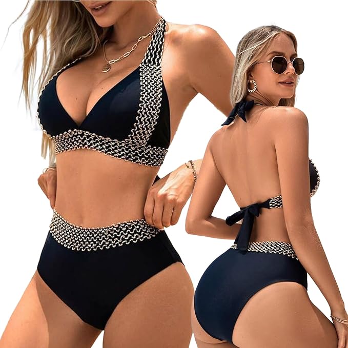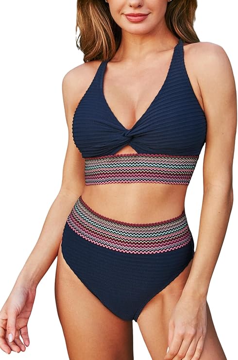 Diseño: el traje de baño de dos piezas con cuello en V cuenta con un agujero en la parte delantera y bandas coloridas debajo del busto que pueden hacerte favorecedor. Conjunto de bikini de tela acanalada con parte inferior de cintura alta que te hace sentir cómoda.