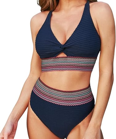 Diseño: el traje de baño de dos piezas con cuello en V cuenta con un agujero en la parte delantera y bandas coloridas debajo del busto que pueden hacerte favorecedor. Conjunto de bikini de tela acanalada con parte inferior de cintura alta que te hace sentir cómoda.